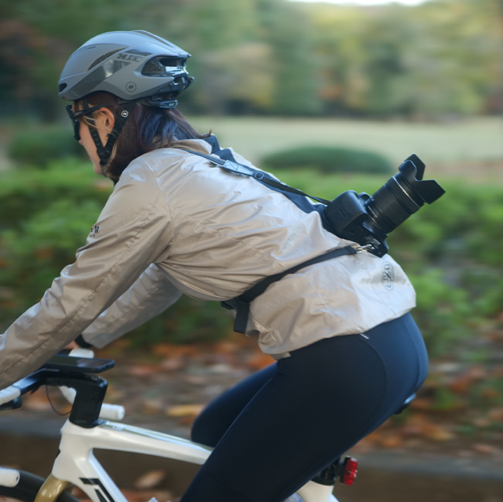 ストラップ本体は滑りの良いナイロンを採用、ジャージとの摩擦が少ないため、スムーズにカメラを構えることができ、シャッターチャンスを逃しません。また、薄手・軽量でかさばらず、耐久性も試験済み、さらには洗濯可能で衛生的。カメラとともに楽しむサイクリングについて考え抜かれた設計となっています。